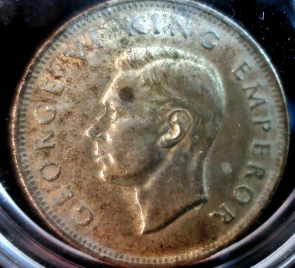 earlier versions of this design (KM#4 in Krause). Percy Metcalfe designed the obverse portrait, which in my opinion